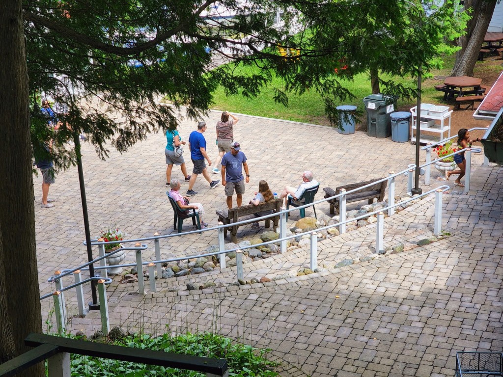 [The patio – not unlike sitting on a bench in Central Park . . . ]