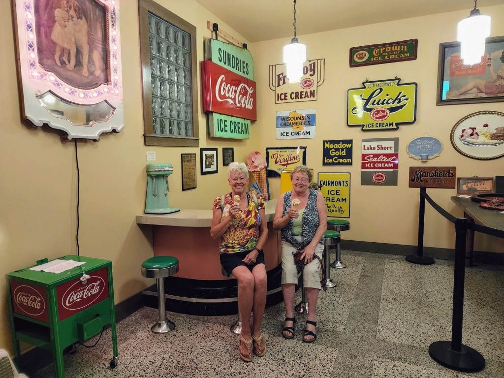 [The Biddies enjoying an ice cream cone in Gessert’s Ice Cream & Confectionery in downtown Elkhart Lake, celebrating 100 years in business . . . ]