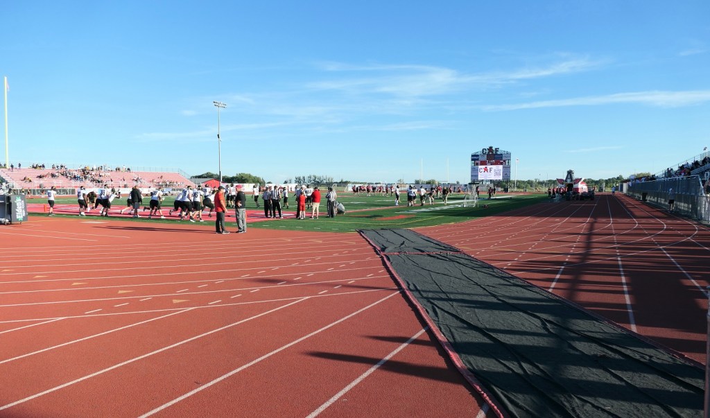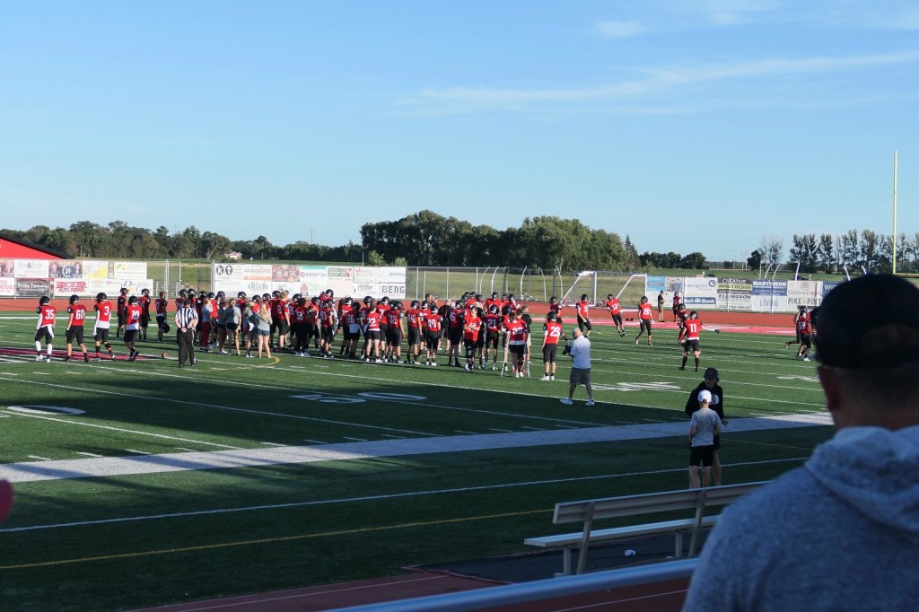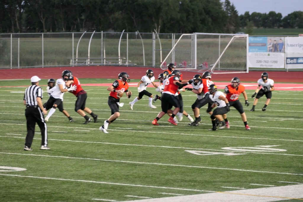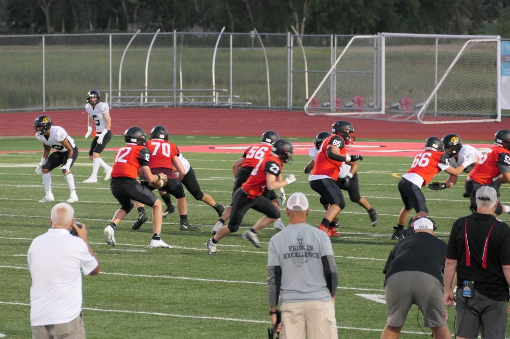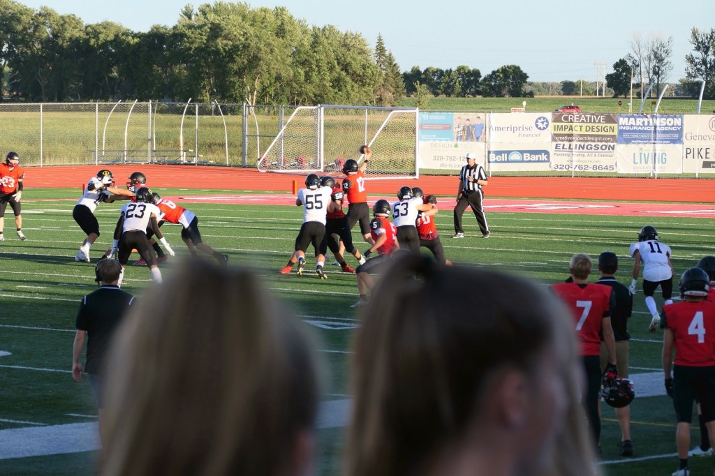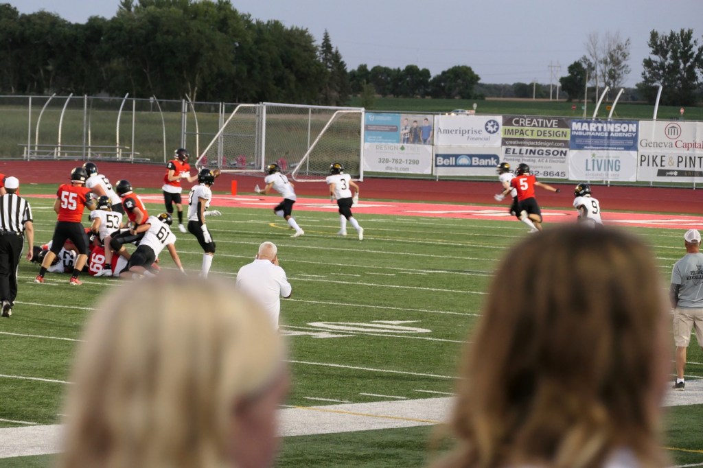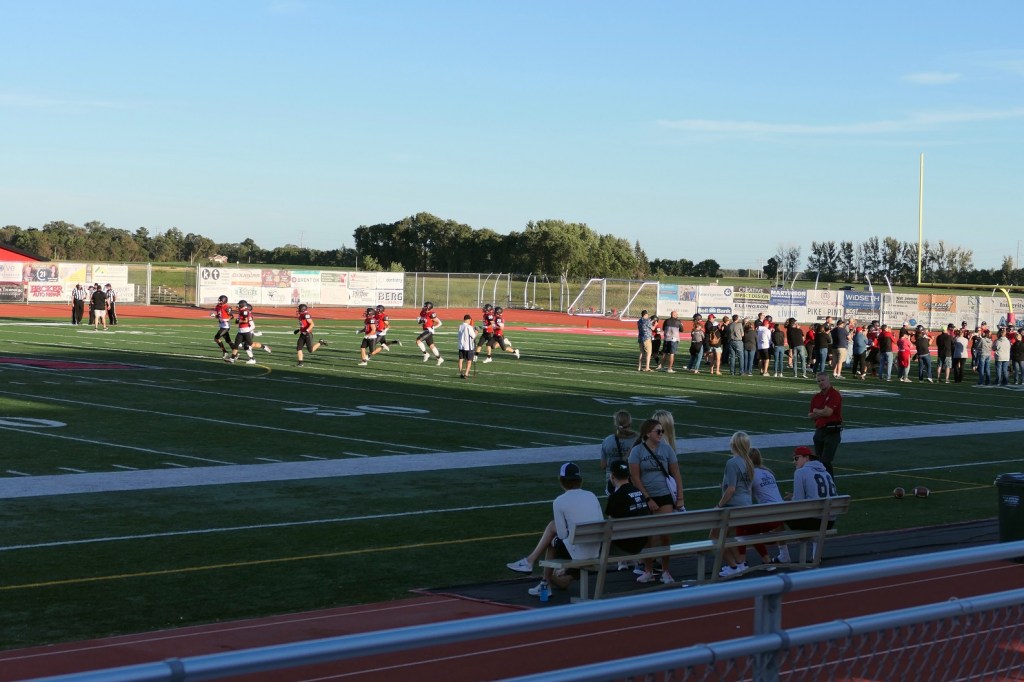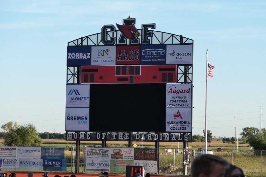 [The blank scoreboard indicated things were not going to go well. The gentleman sitting next to me said it wasn’t working for the girls soccer game a few days before. It’s brand new this season, but it’s off to a tough start. But even worse, while it has large billboard advertising, the digital part offering up such useful things at the time, the score, and down and distance are so small I had to squint from the other end of the field once they got it up and running later in the first quarter . . . ]