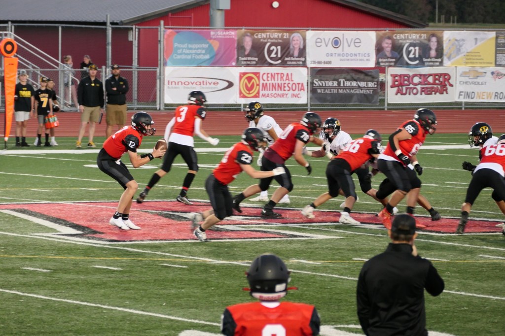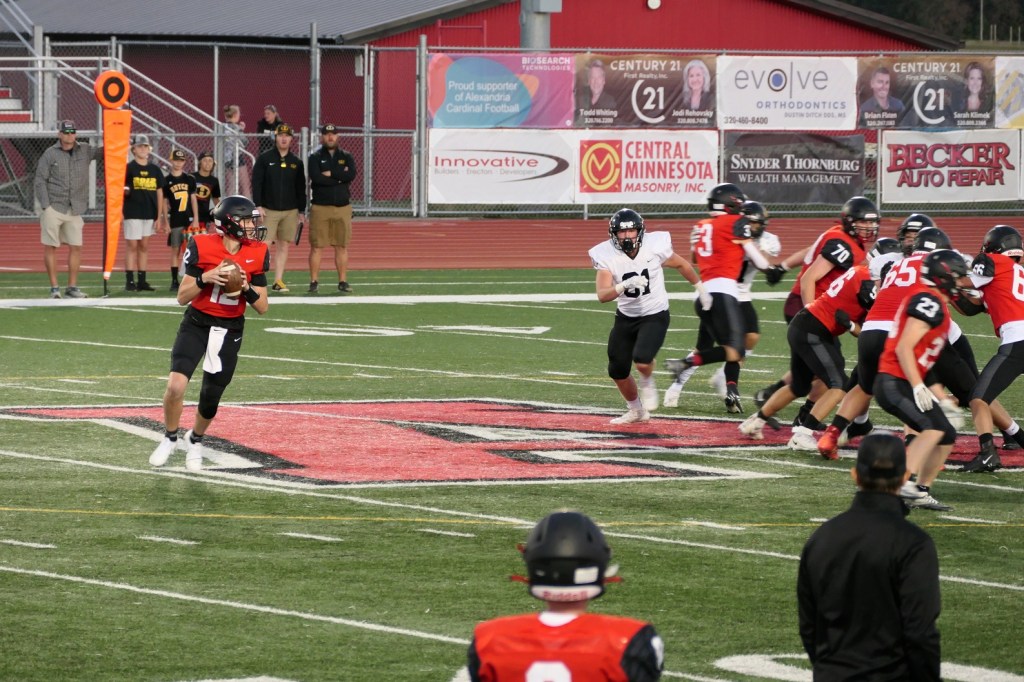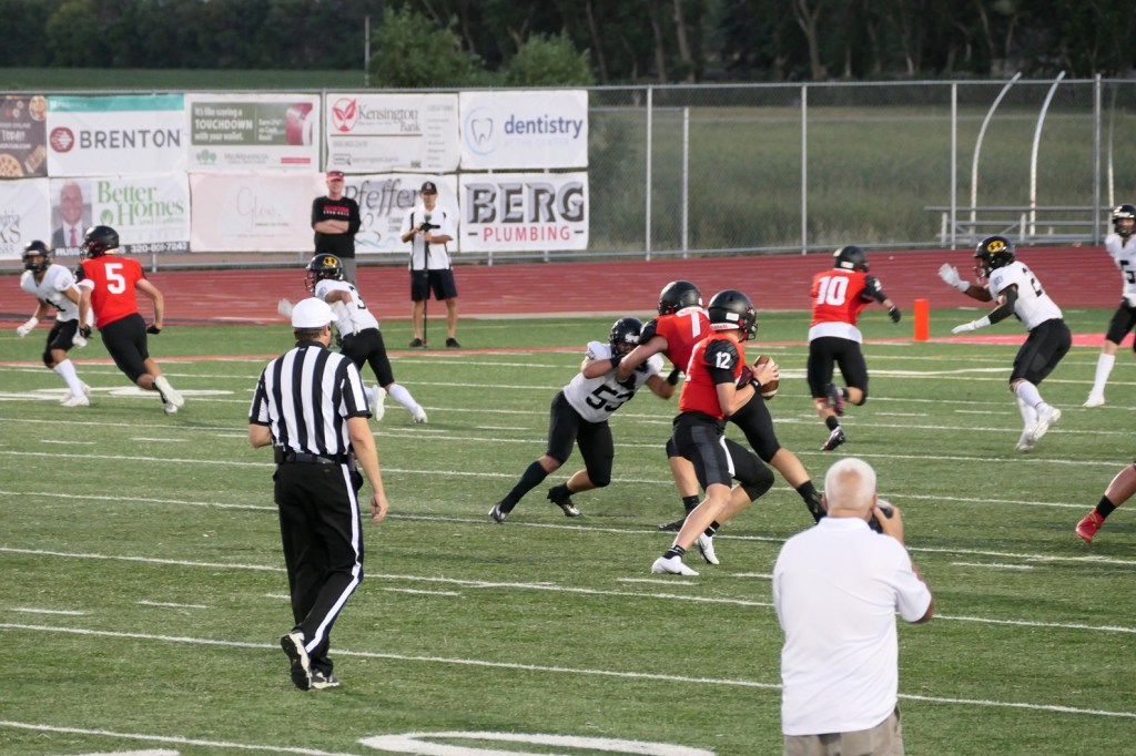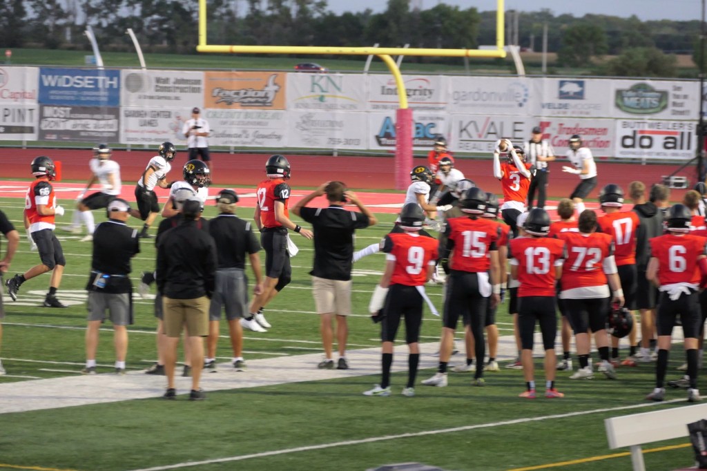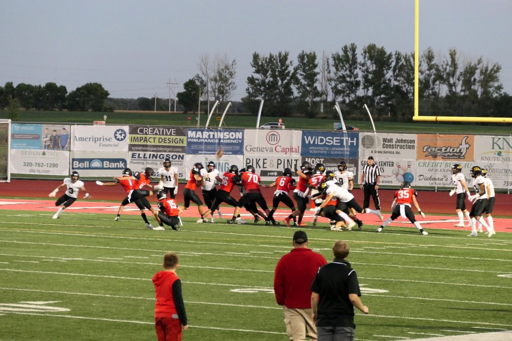 [Stuff happens. The first game of the season for the Cards hosted Hutchinson, the defending state champions. The Cardinals graduated all their playmakers from last year. New players at a lot of positions, including a sophomore quarterback starting his first varsity game. This is the first play of the game, an incomplete pass that was then ruled a lateral and recovered by Hutchinson, who scored a couple runs later. The Cardinals had a good kickoff return, but went 3 and out. The snap to the punter went over his head and he fell on it inside the 10 yard line. Hutchinson again scored and led 16-0 before the Cardinals even had one positive yardage pay. In the immortal words of Kurt Vonnegut, Jr., “So it goes.”]