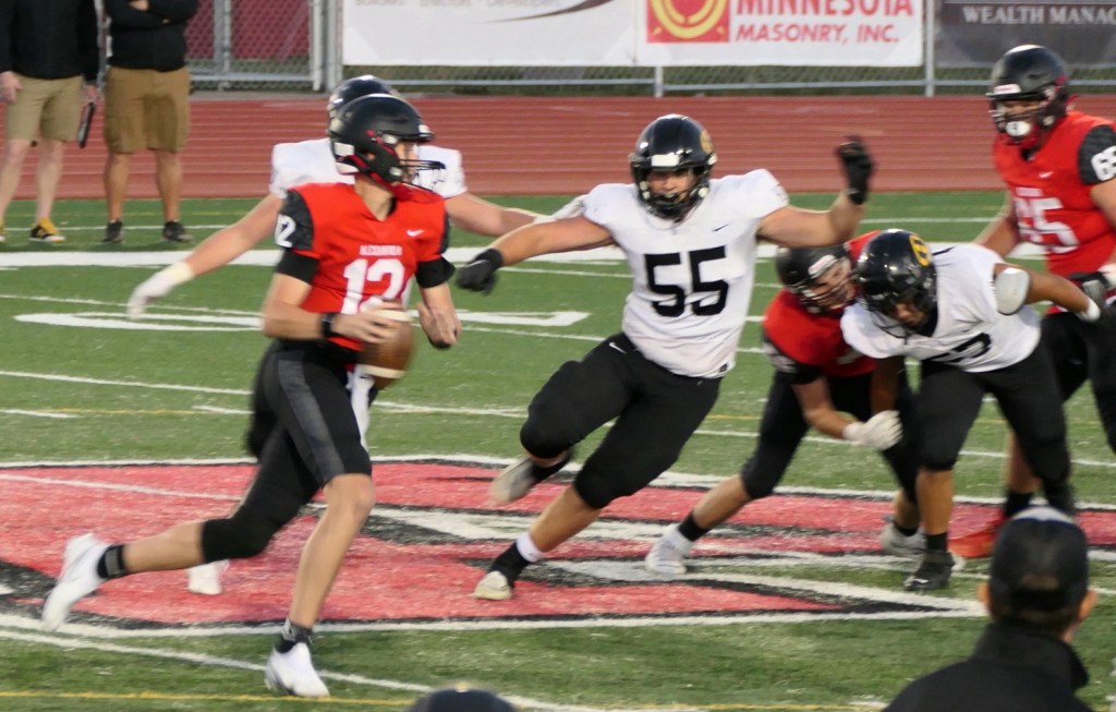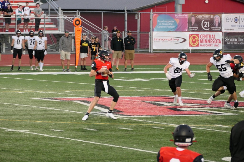 [This is our sophomore quarterback, 6’7″ Chase Thompson, whose 7′ tall brother Treyton is on the Minnesota Gopher basketball team. Chase will be very good, already a topnotch basketball player, but until this last Cardinal series right before the half we were down 32-0 and had not yet attained a single first down. Chase led us down the field for a Cardinal touchdown with 4 seconds left in the half . . . ]