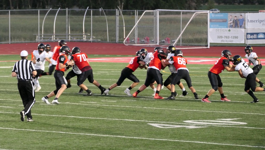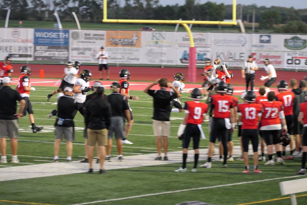 [That’s Mark Ripley in the white shirt and shorts. He’s the school photographer. I think this night made it the 1,342nd consecutive Cardinal football game he has attended. That means drives home from such places as Bemidji in December in sub-zero temperatures and blizzards . . . ]