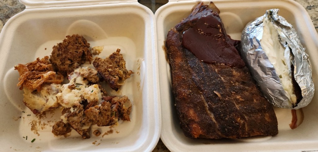 [Every other Monday we go to a Community Ed movie. After the movie we have a discussion and then go to dinner at Longtrees. On this day, Ruthie & I ate lightly – I had the meatloaf dinner (on the left) and Ruthie had the carnivore special, ribs and chicken (on the right), which yielded one more meal for me and three more meals for her . . . ]