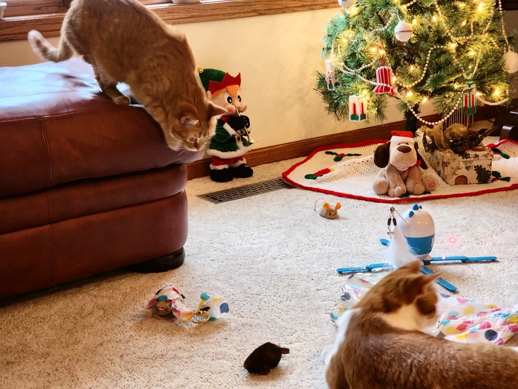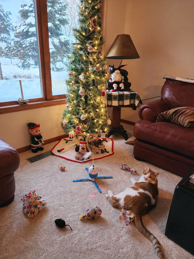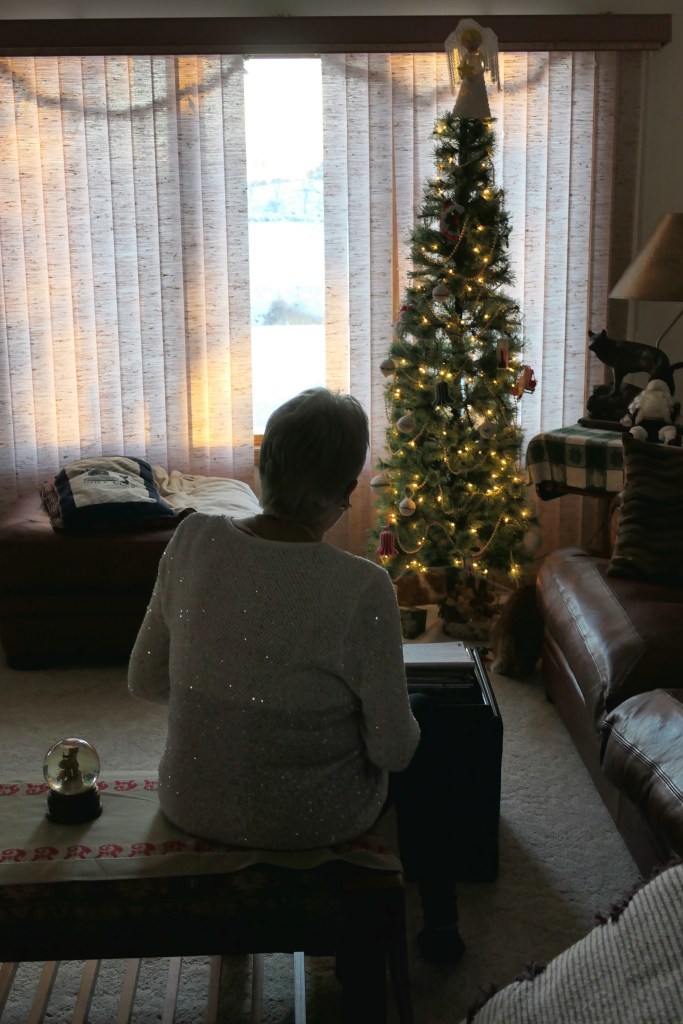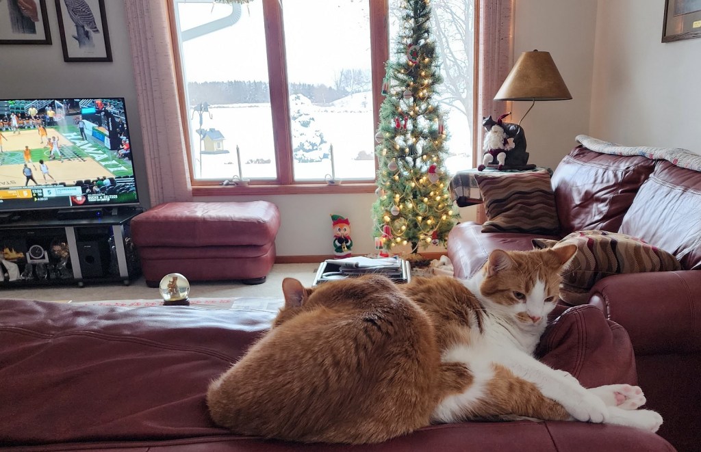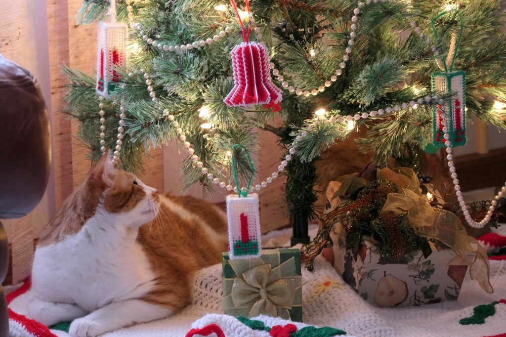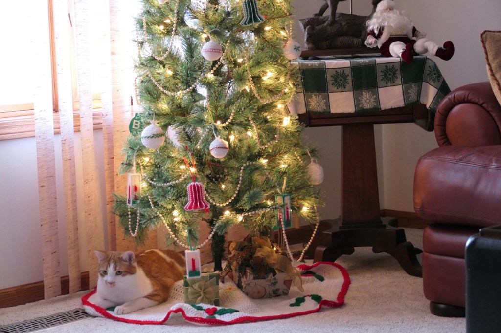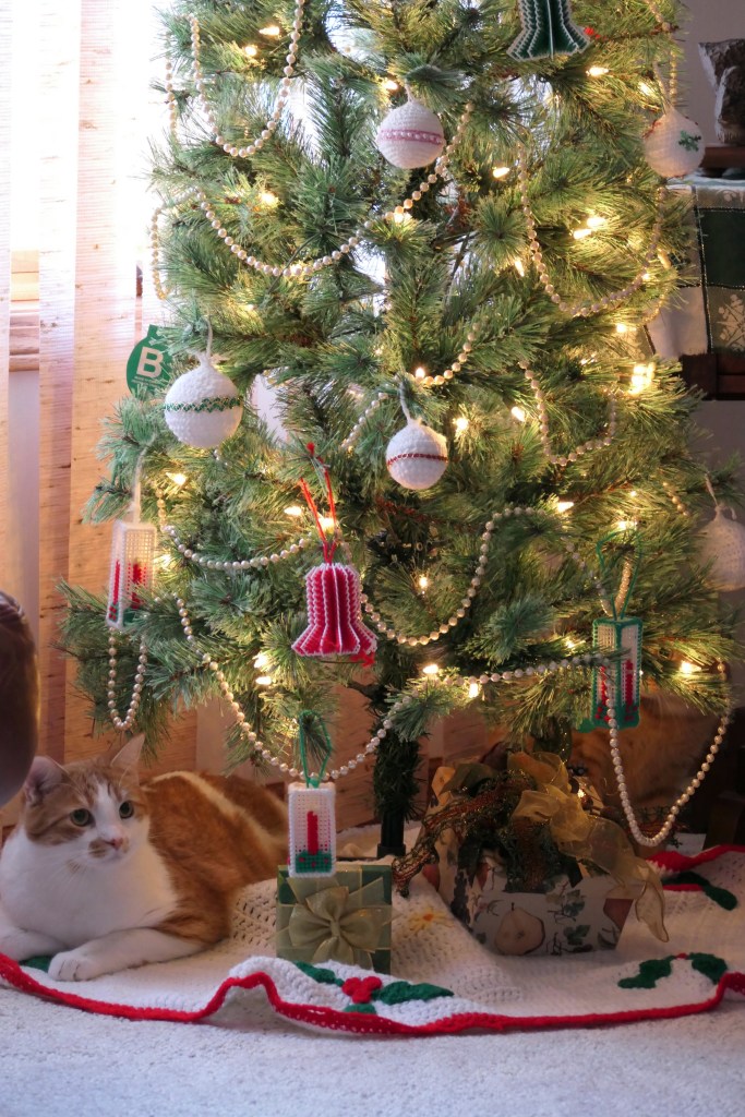 [We had planned on cruising around South America over the holidays, but . . . stuff happens. Ruthie could not stay home then without putting up a tree, which she did on this day. Laddie (here) and Guinie were so appreciative . . . ]