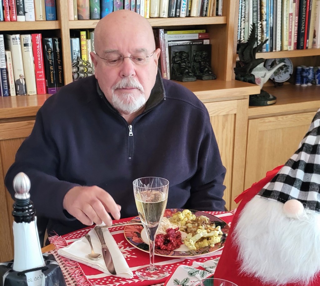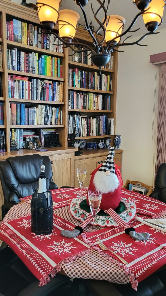 [The Super and I indulged in our traditional Christmas Eve dinner of grilled cheese sandwiches and tomato soup. In later years champagne also entered the picture . . . ]