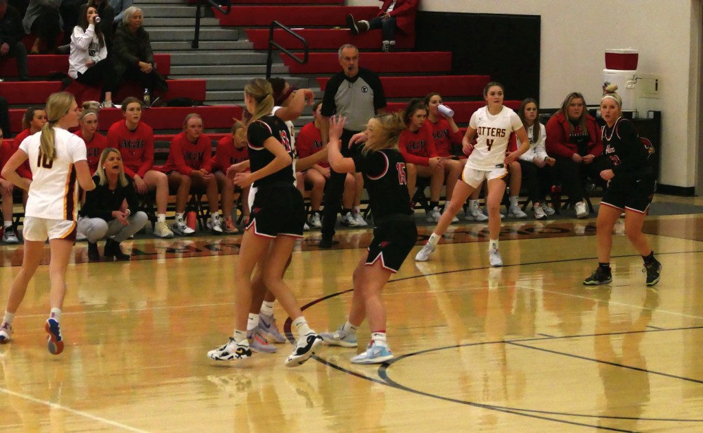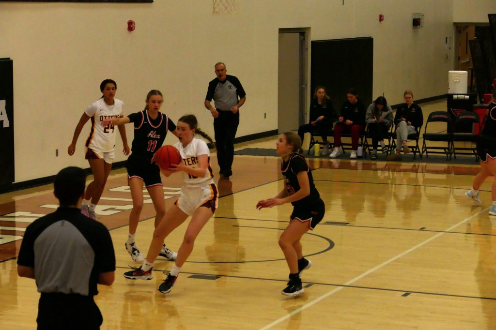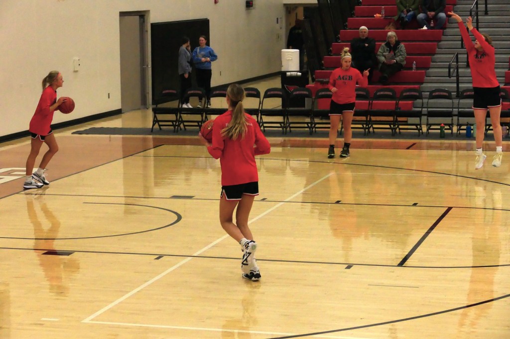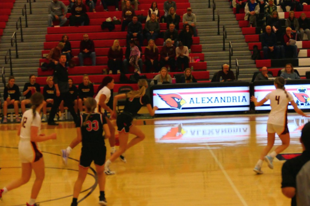 [Senior Morgan Seesz heading back up court with Hadley after a change of possession . . . ]