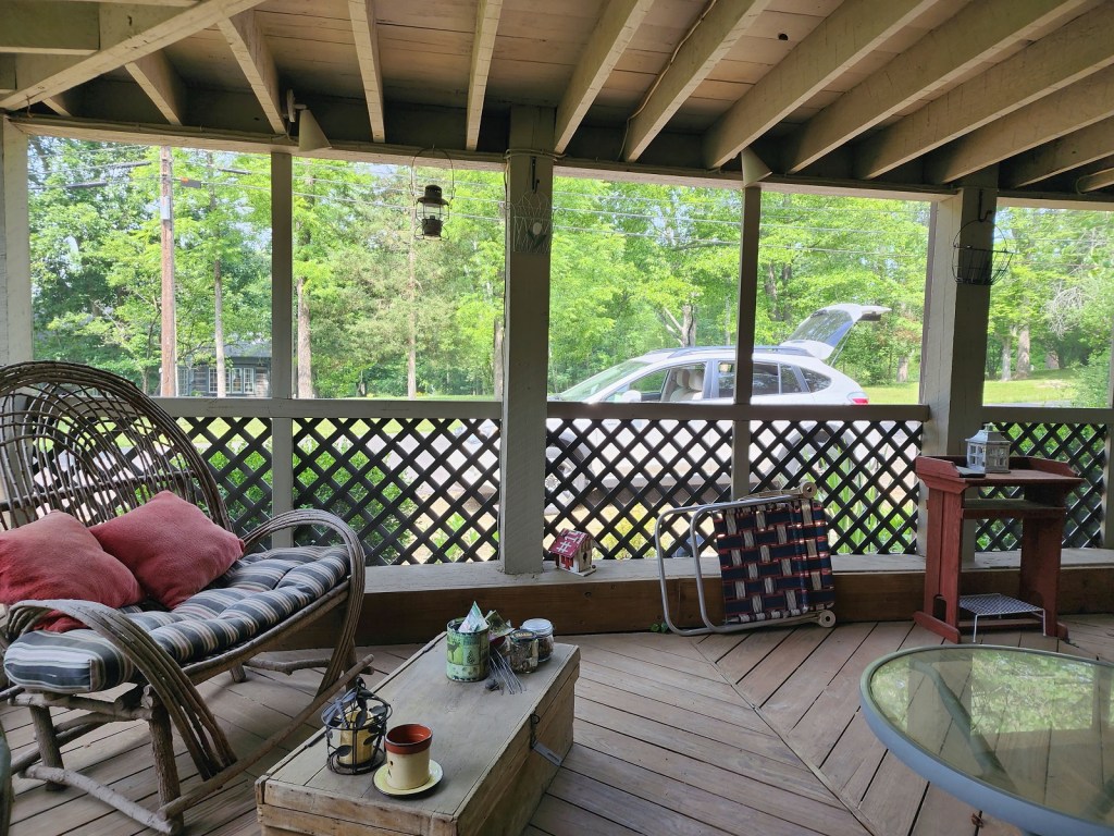 [Her porch view to the west (toward Bloomington) reflects the “mountains” of Brown County . . . ]
