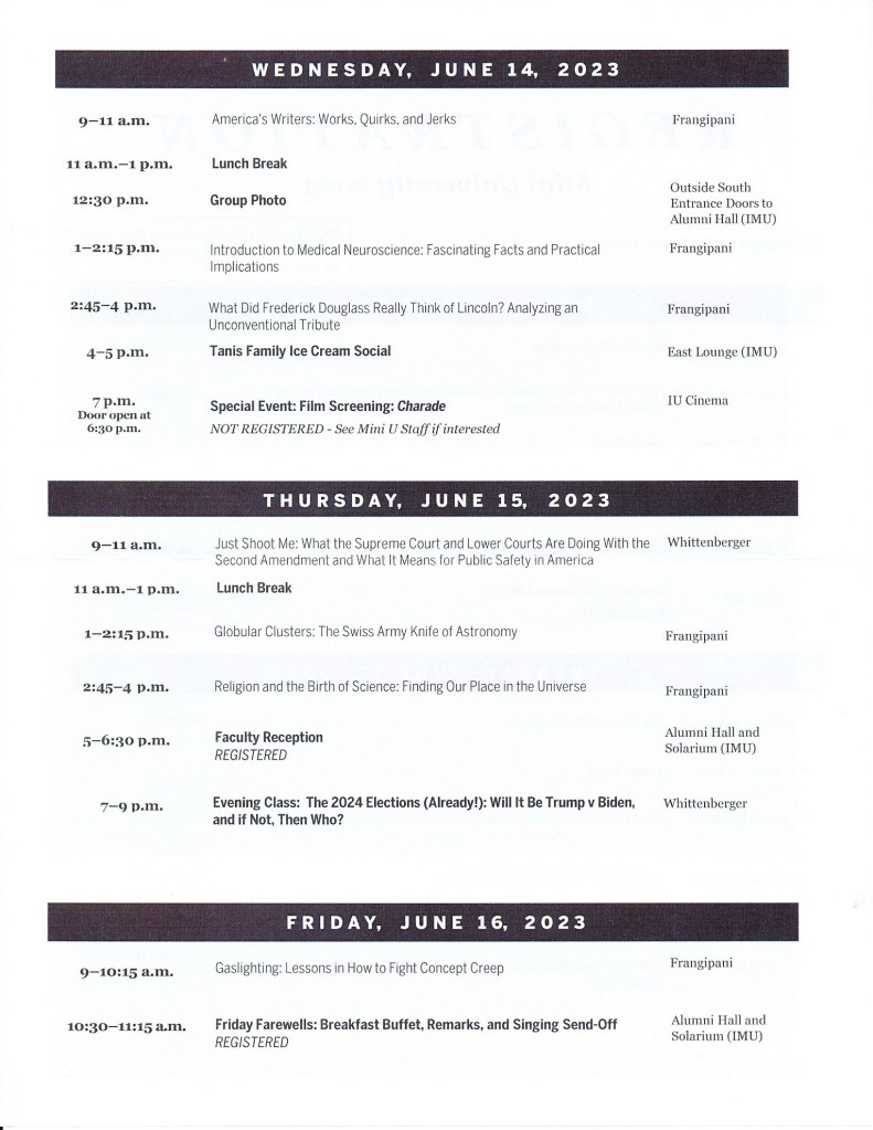[The penultimate day of college (we have a morning class tomorrow). We have had a lovely week and today we look forward to classes from the superstars. Beth Cate (a Supreme Court expert) begins the day with “Just Shoot Me . . . “, about the 2nd Amendment, of course; and this evening Margie Hershey will address a packed auditorium about the “2024 Elections”.]