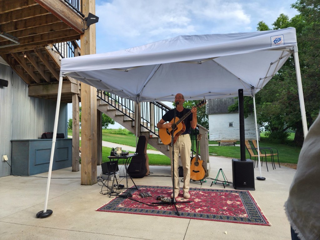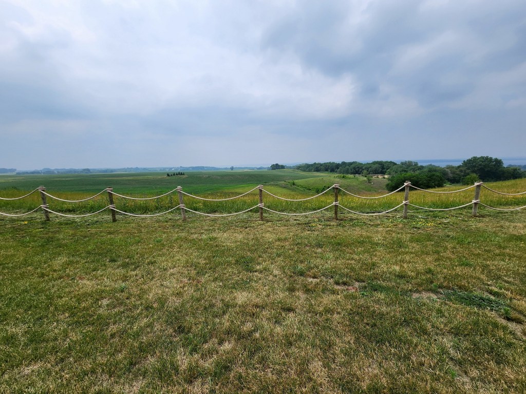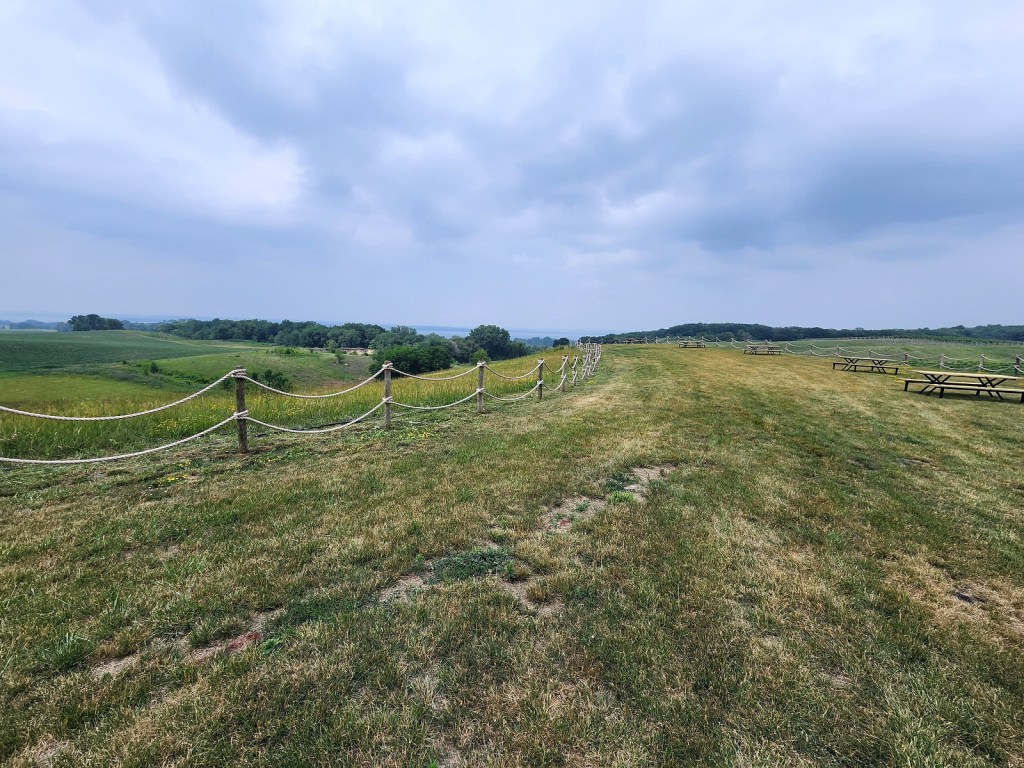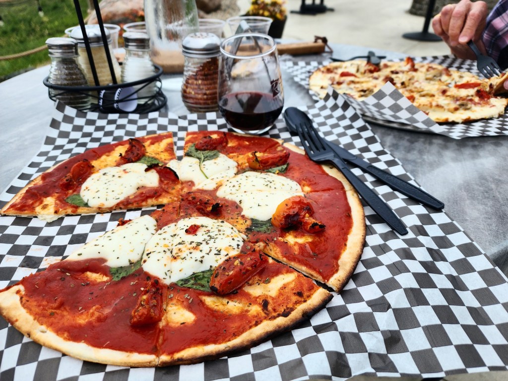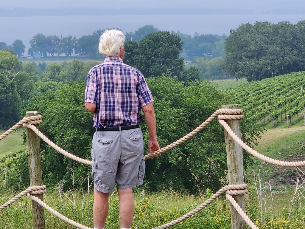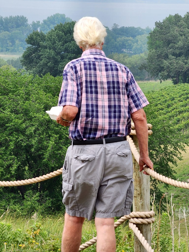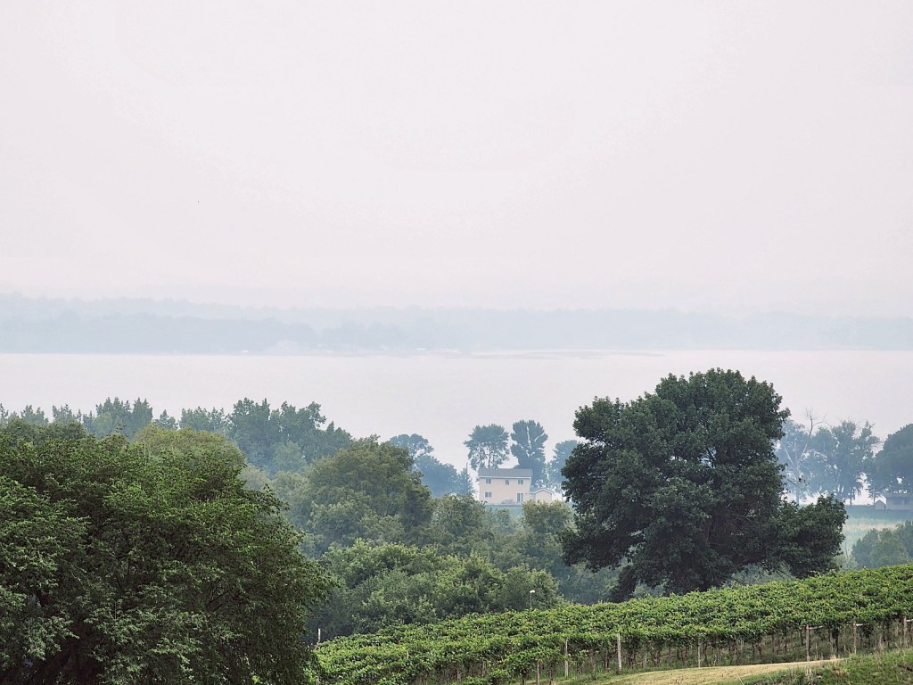[The Boys of ’65 wandered down to Glenwood yesterday for a nosh at Rolling Forks Vineyards on the south side of Lake Minnewaska. Bradley unfortunately is still on an extended medical sabbatical – but we’re cheering for him. Mayo opted for a fleet of sweet wines while I had Marquette Reserve as beverages for our pizzas. After a month of sunny rain free days, the much needed rain finally arrived and its aftermath made for a somewhat hazy cloudy day with limited visibility of the scenic lake lying below us. Despite that, Mayo’s first impression was that of a lovely place to enjoy such an outing. We enjoyed our usual three hours together and hope to get together as a threesome again next month . . . ]