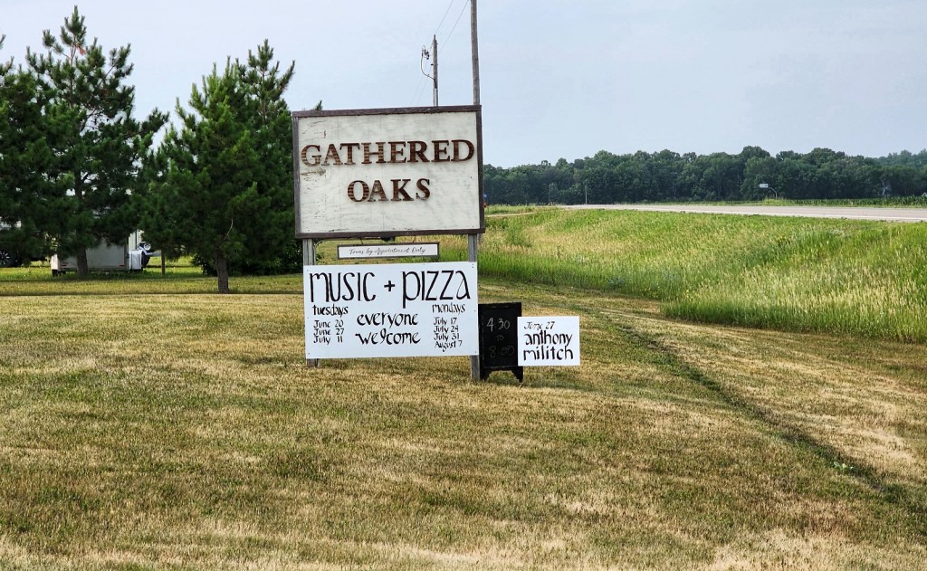 [Full bar, pizza oven, and food, at Gathered Oaks . . . ]