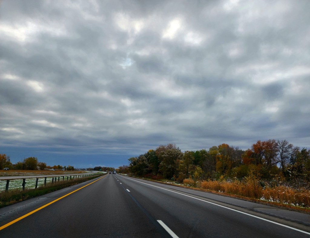 [We weren’t on the road home yet, but this was the sky all day. We had several hard downpours on the way home . . . ]