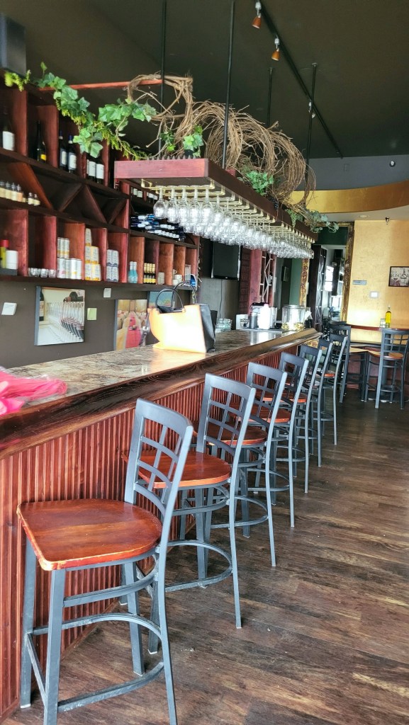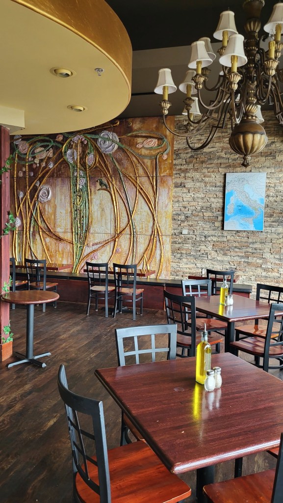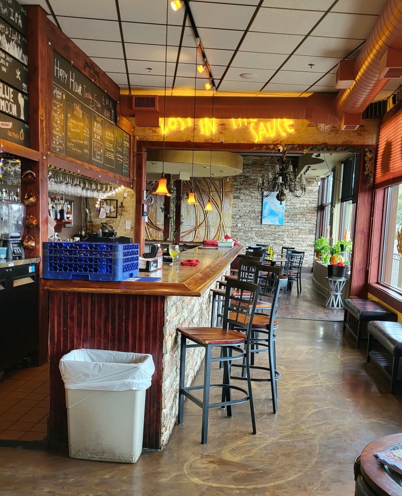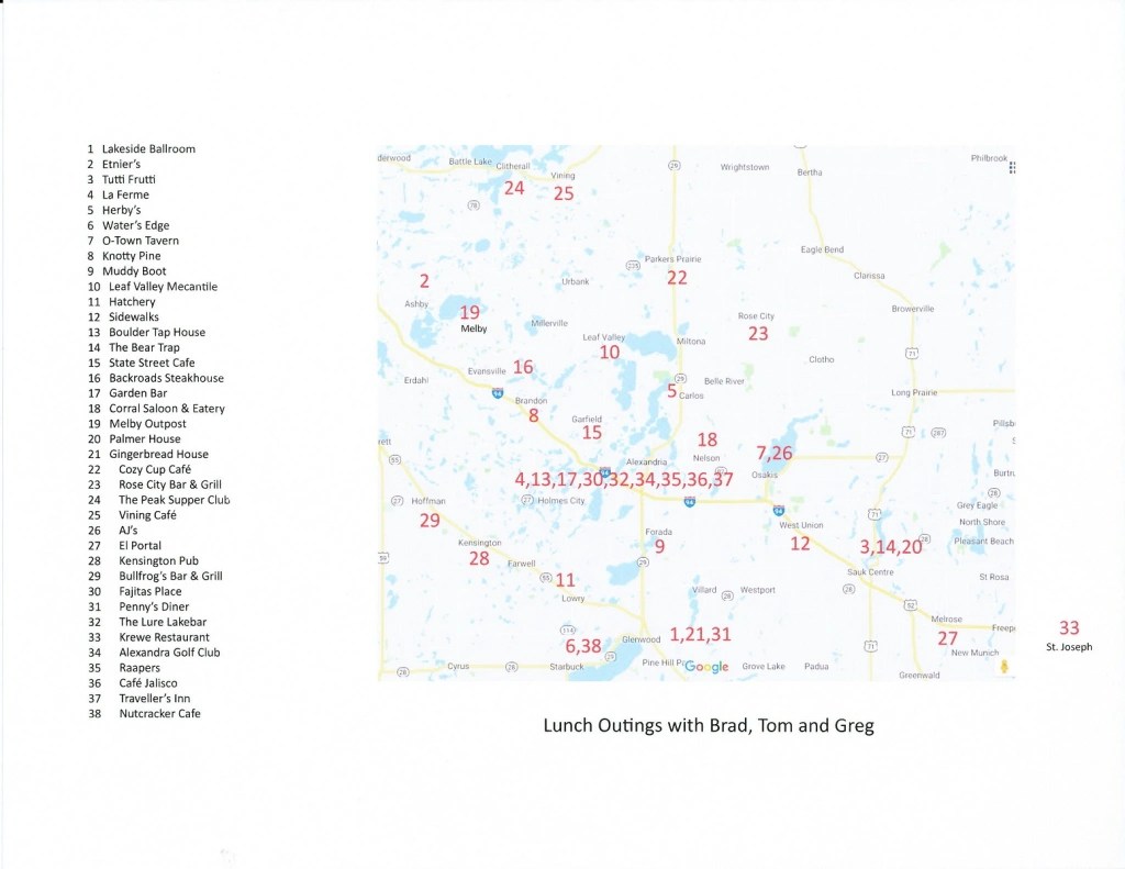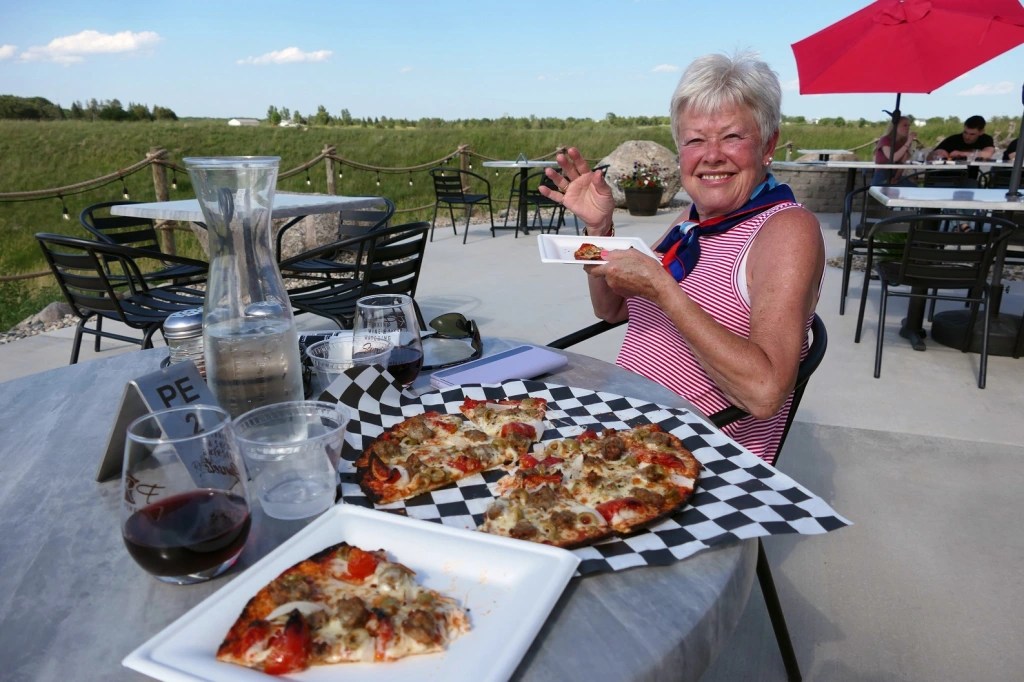 [We had hoped to lunch at Krewe, the cajun/creole restaurant in St. Joseph, but it closes at 2:00 (re-opens at 4:00 for dinner) and we got there at 2:01! If Krewe is closed when you get there, there’s always Bello Cucina! The one in St. Joe is the last one standing. We have been to the ones in Glenwood, Alex, Fergus, Morris, and Marshall, all now closed. The owner said he can’t find chefs or staff . . . ]