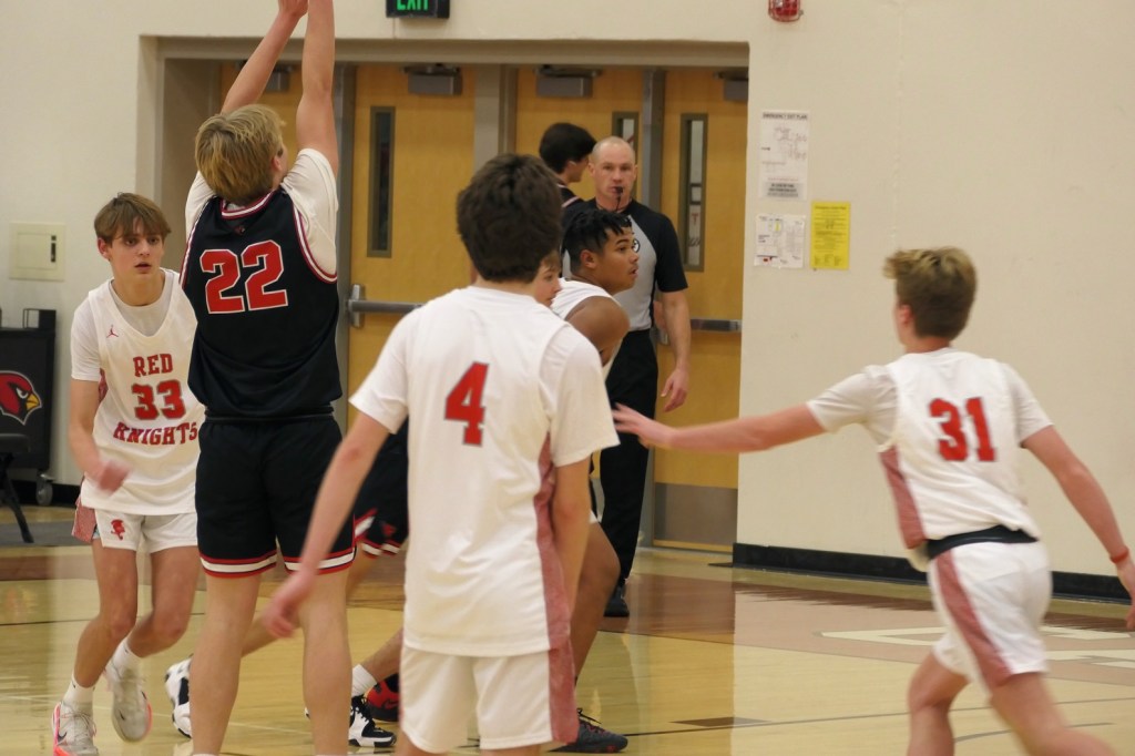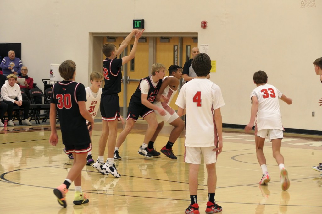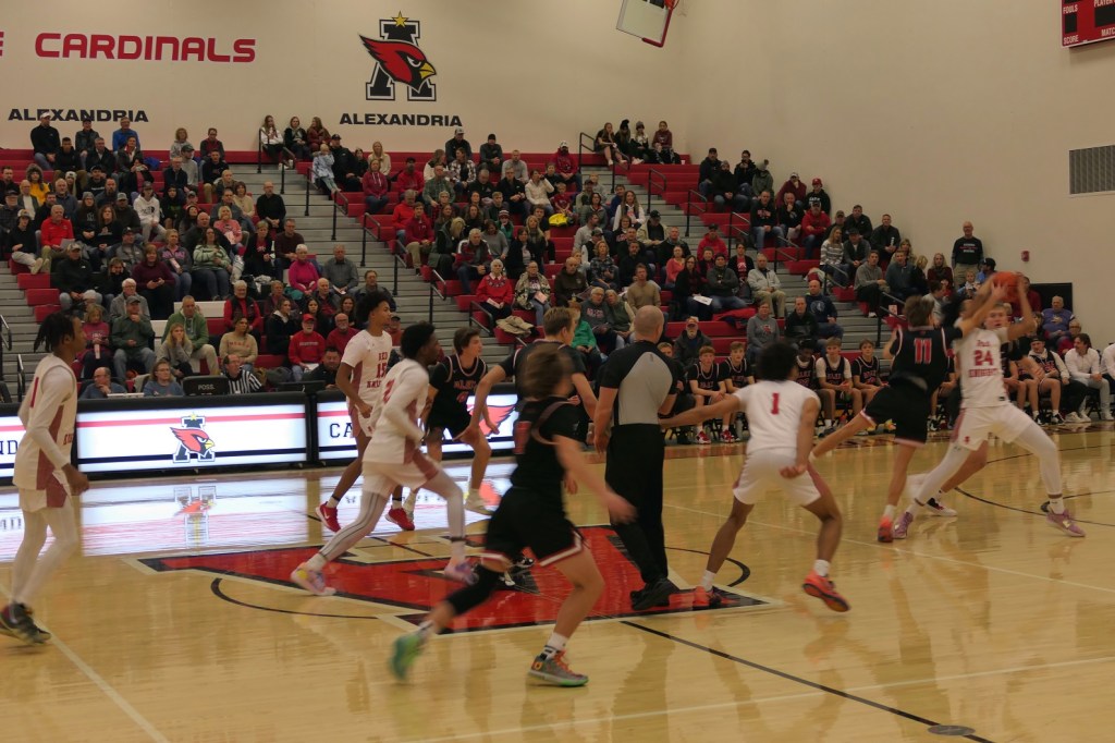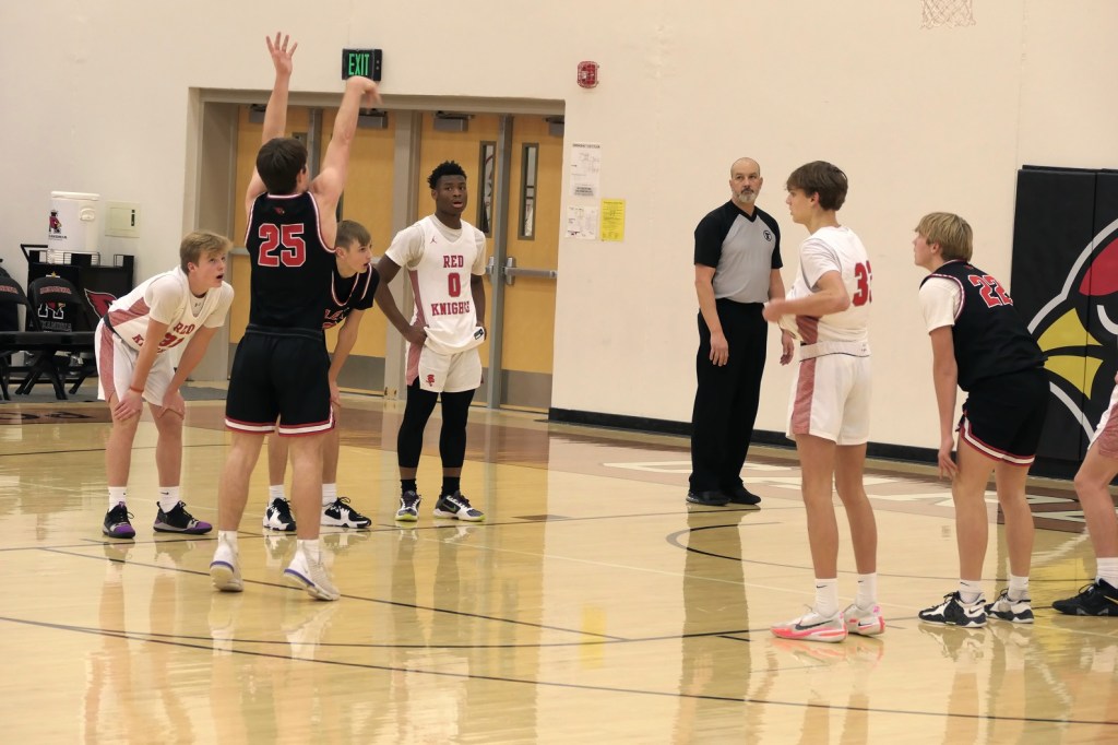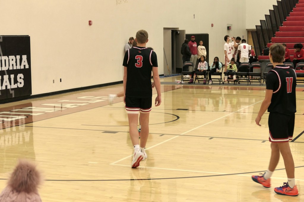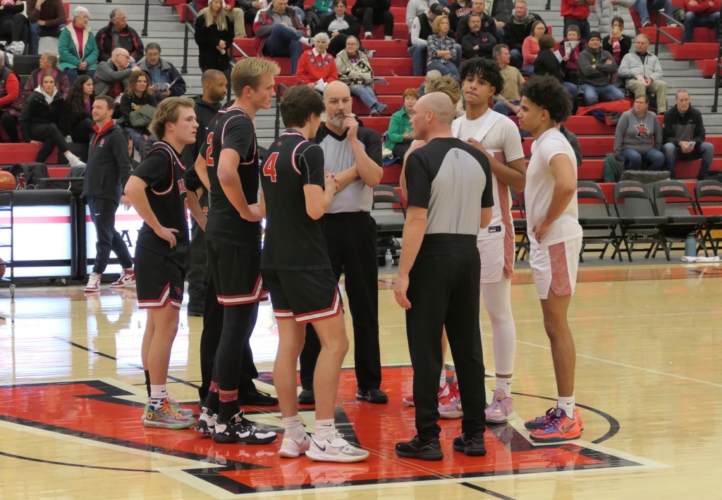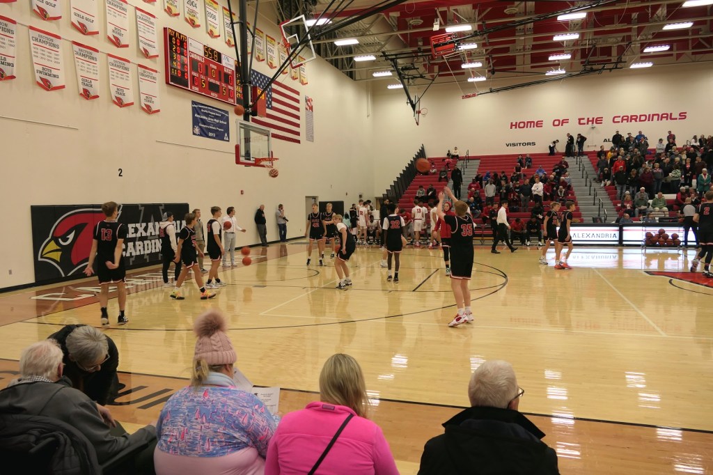 [Our senior captains are Trevin Hoepner (0) and Jaxon Schoenrock (4) with 6’9″ junior center Grayson Grove (2). The aforementioned Ella Grove was at the game on support of her little brother . . . ]
