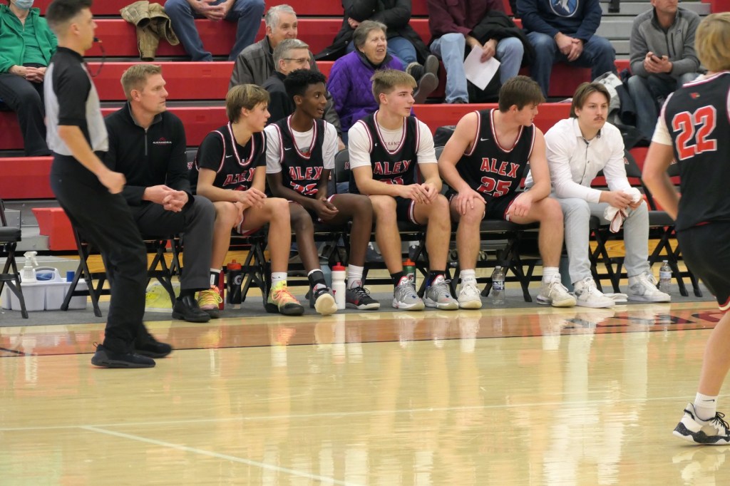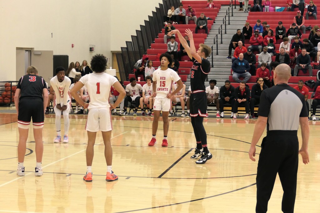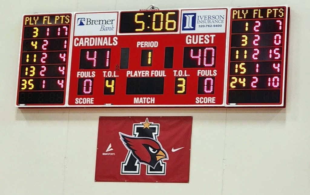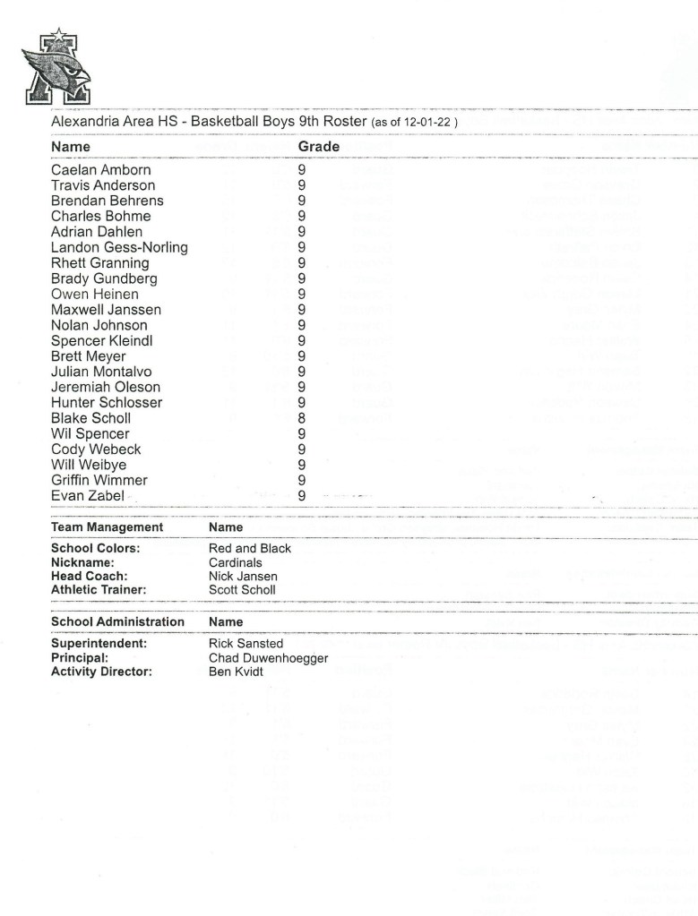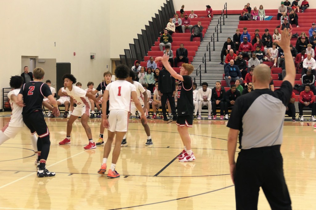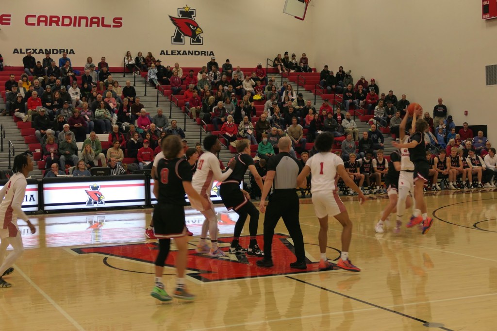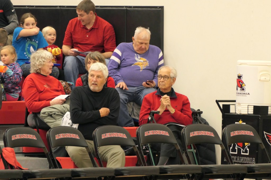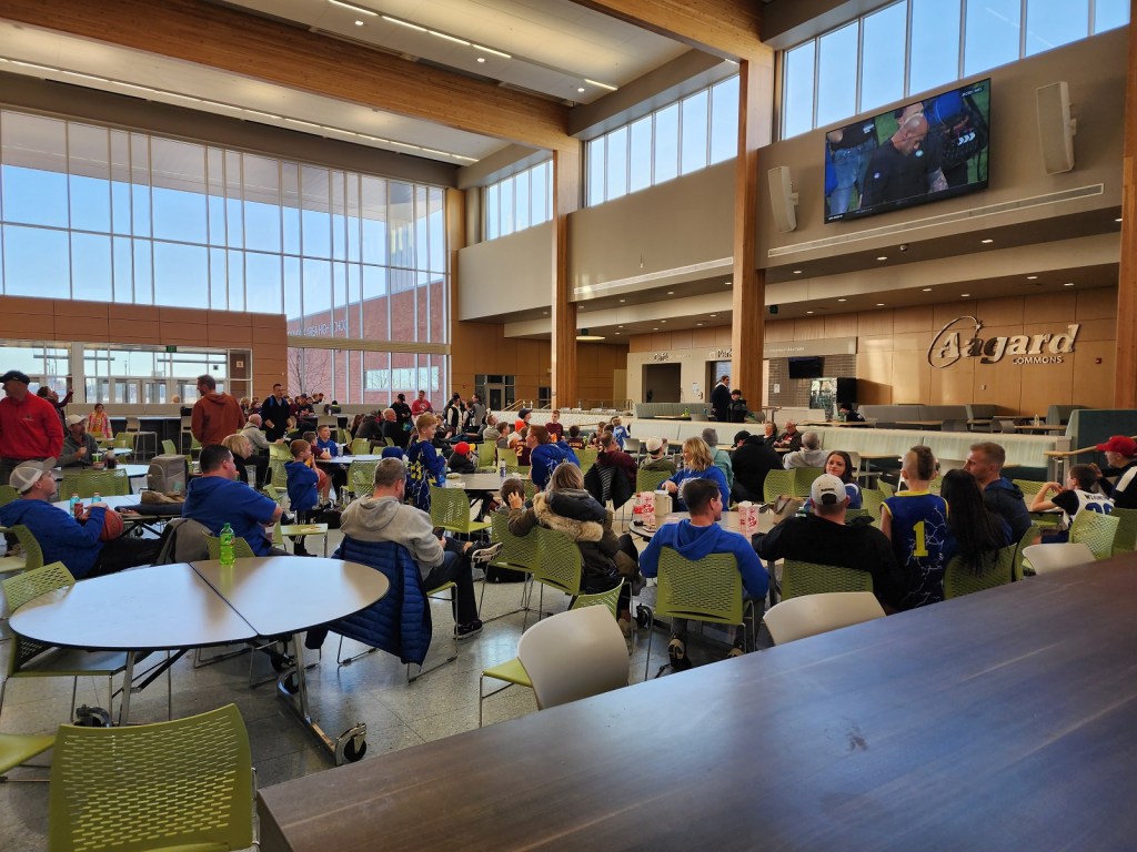 [Our senior captains are Trevin Hoepner (0) and Jaxon Schoenrock (4) with 6’9″ junior center Grayson Grove (2). The aforementioned Ella Grove was at the game on support of her little brother . . . ]