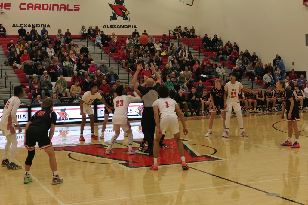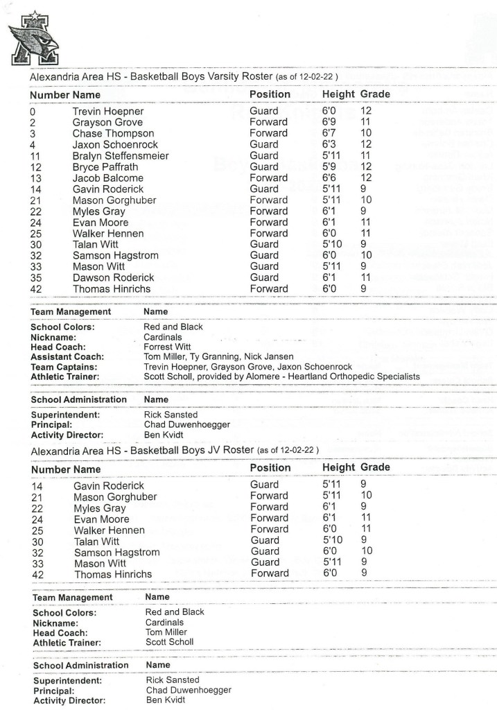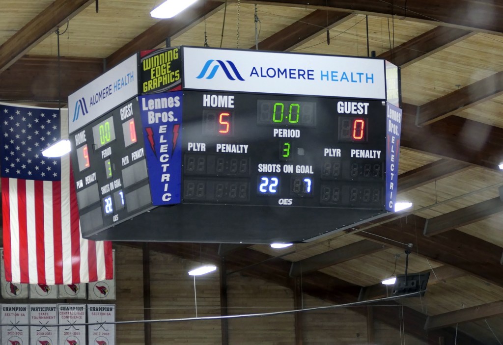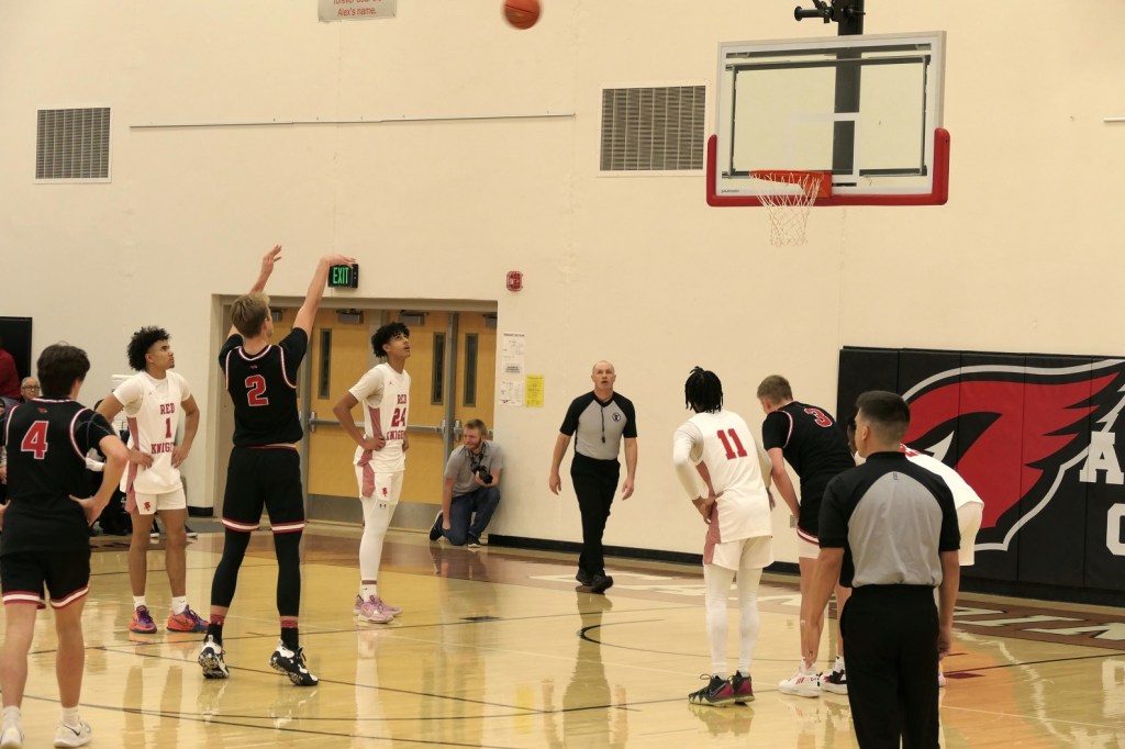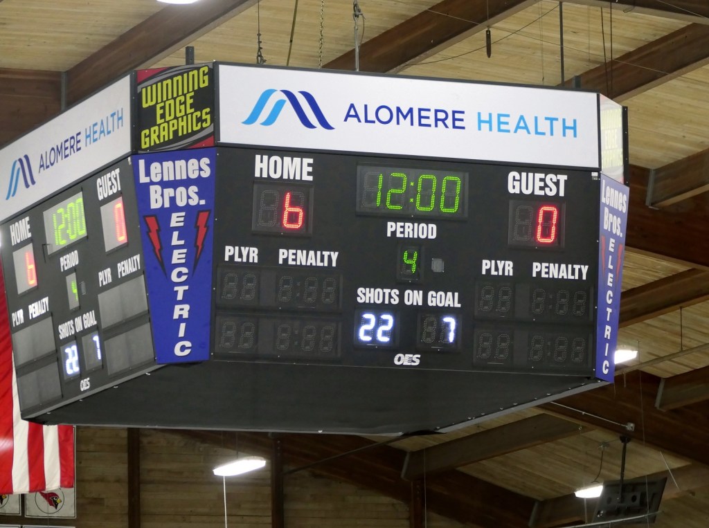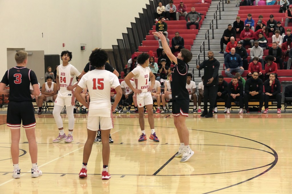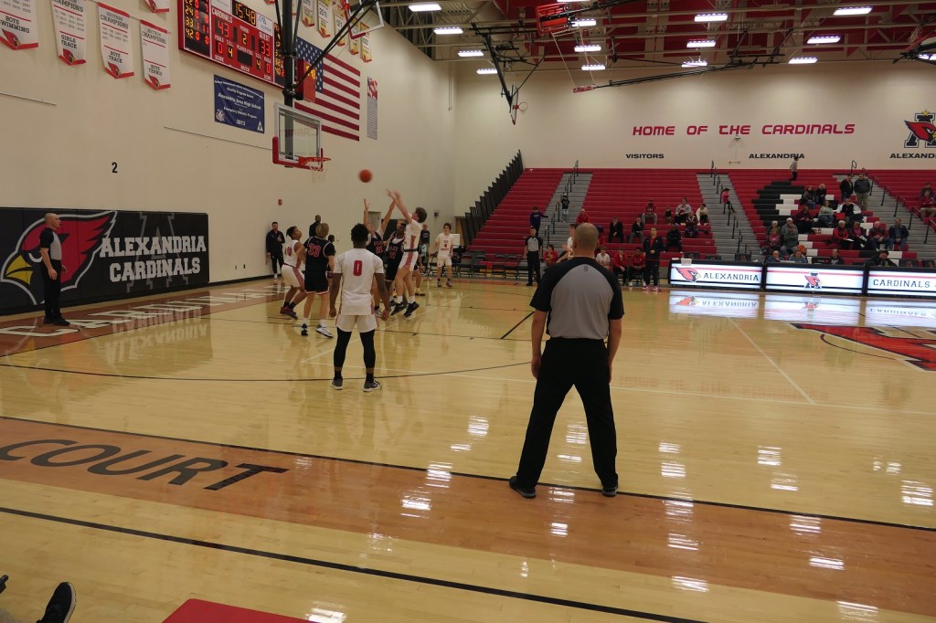 [Our senior captains are Trevin Hoepner (0) and Jaxon Schoenrock (4) with 6’9″ junior center Grayson Grove (2). The aforementioned Ella Grove was at the game on support of her little brother . . . ]