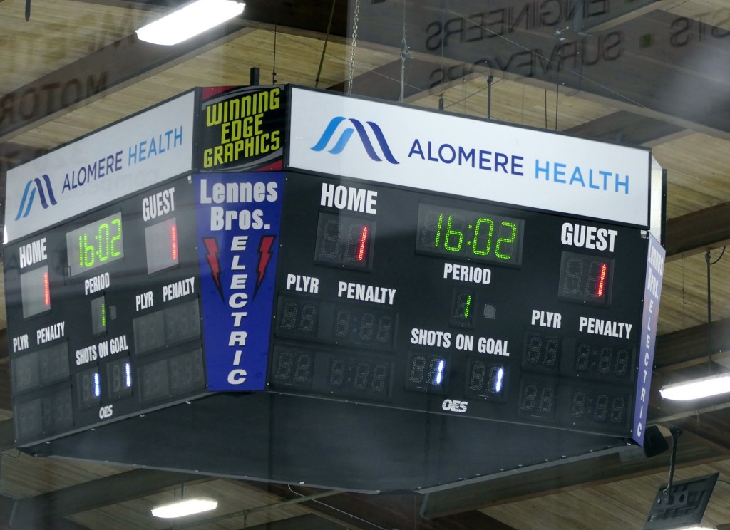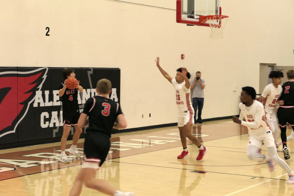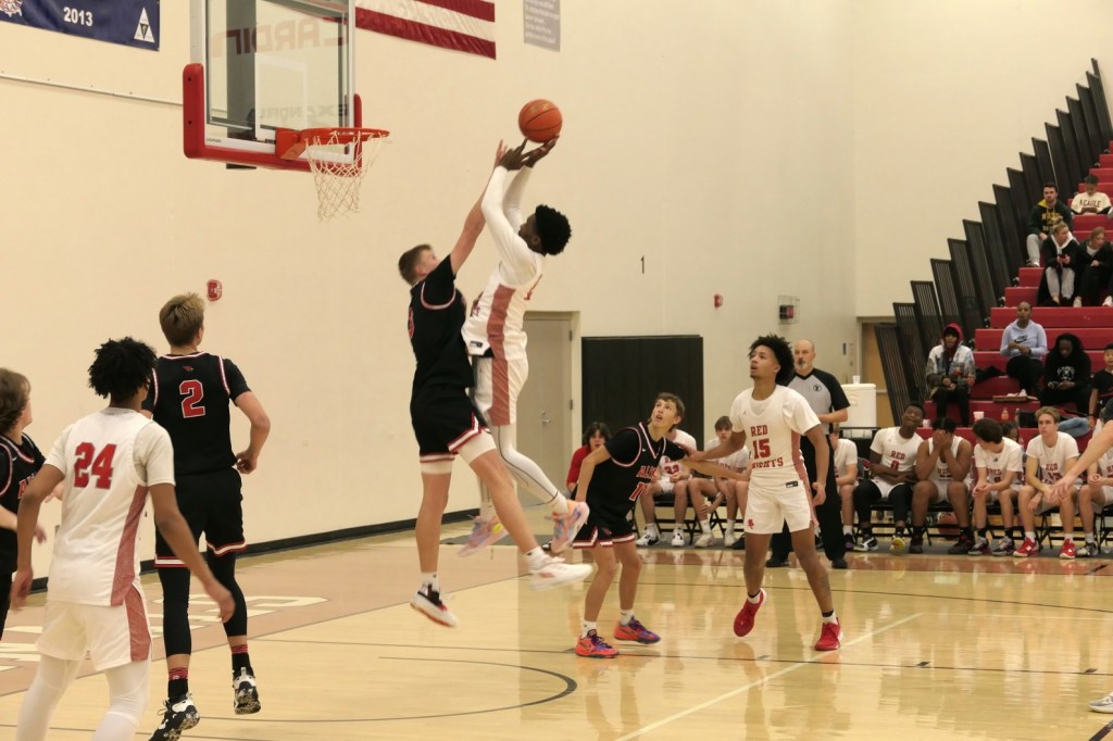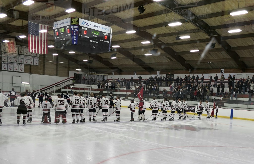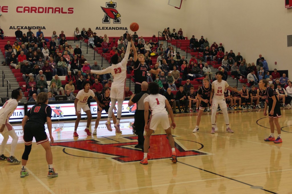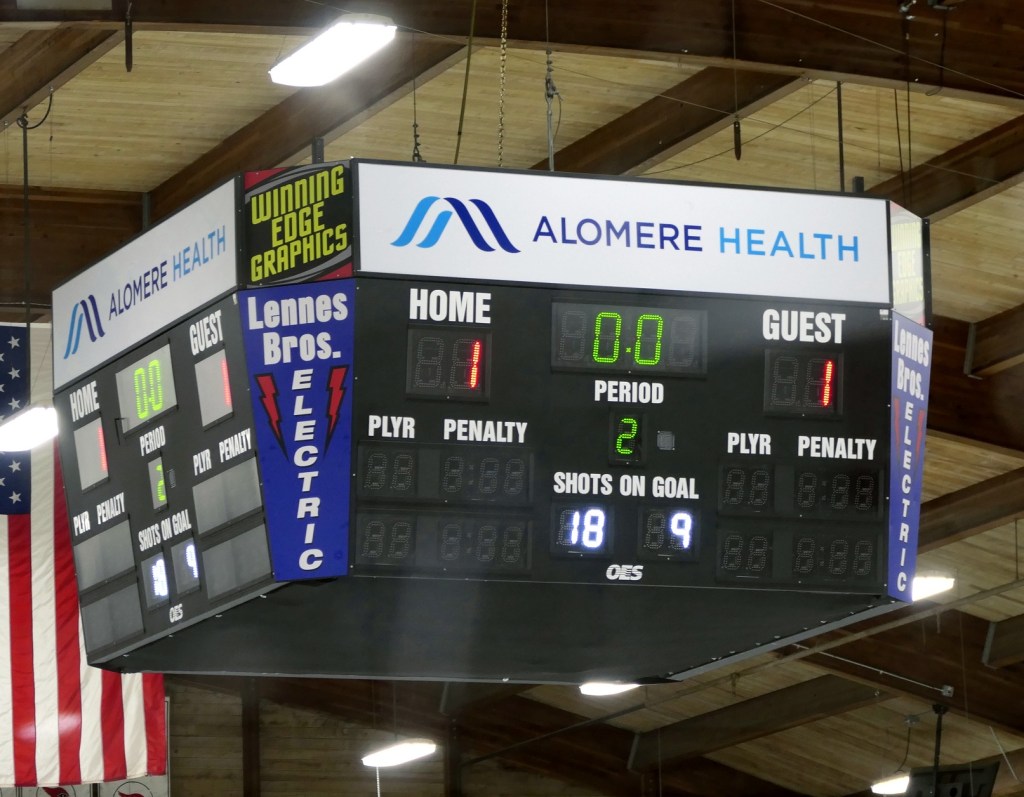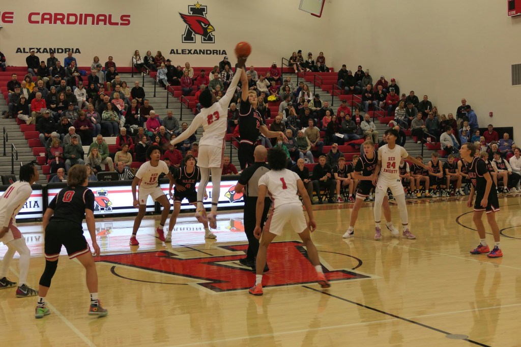 [Our senior captains are Trevin Hoepner (0) and Jaxon Schoenrock (4) with 6’9″ junior center Grayson Grove (2). The aforementioned Ella Grove was at the game on support of her little brother . . . ]