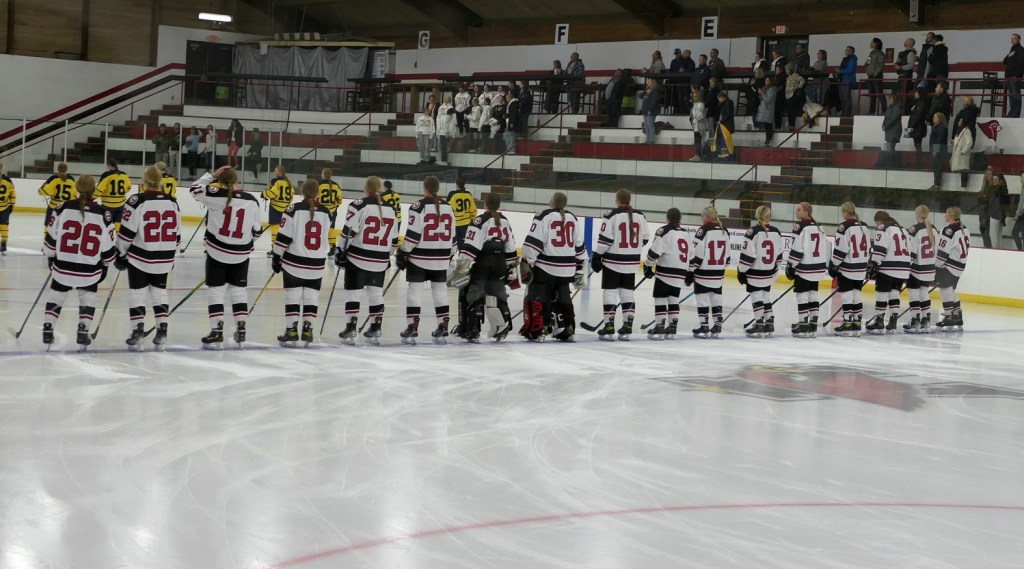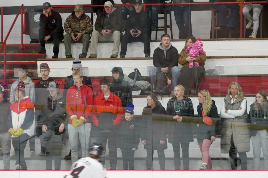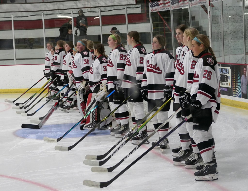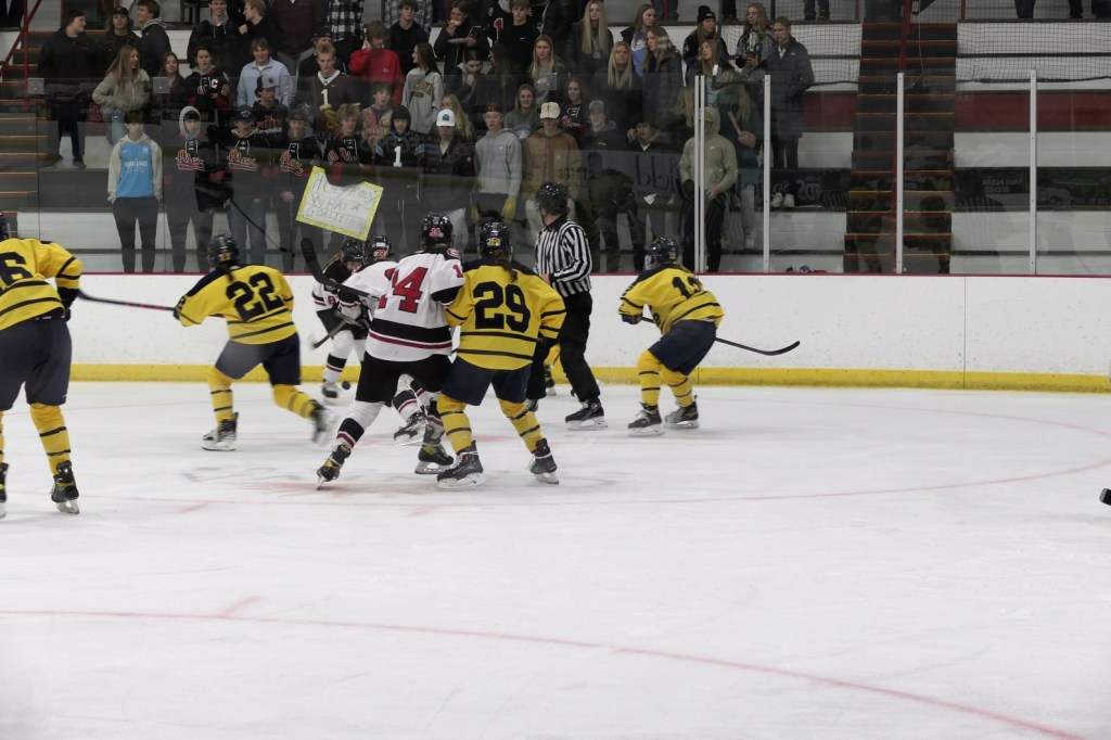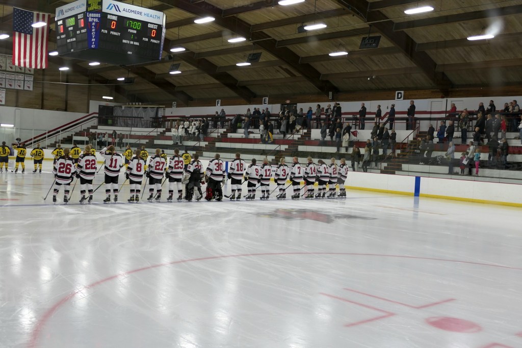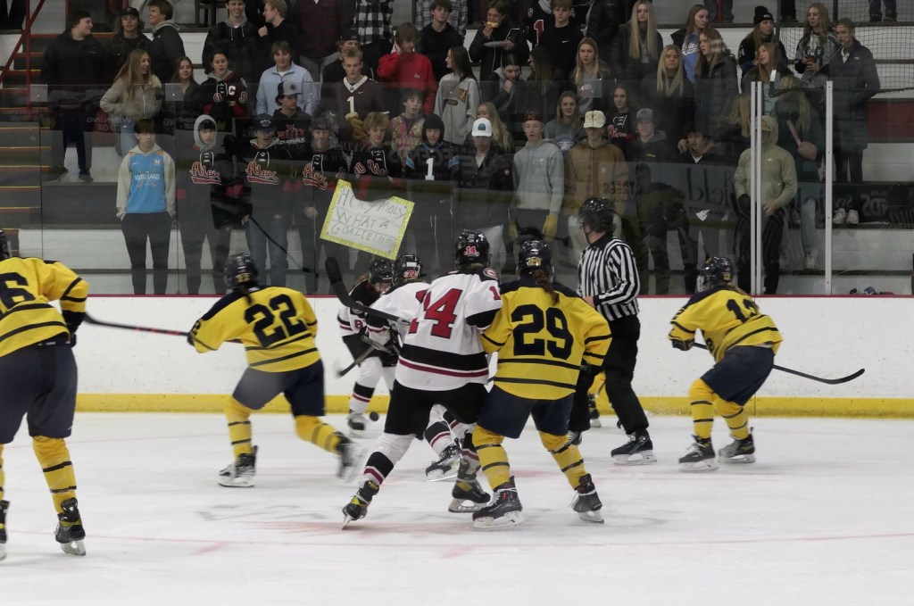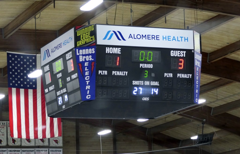 [Our senior captains are Trevin Hoepner (0) and Jaxon Schoenrock (4) with 6’9″ junior center Grayson Grove (2). The aforementioned Ella Grove was at the game on support of her little brother . . . ]