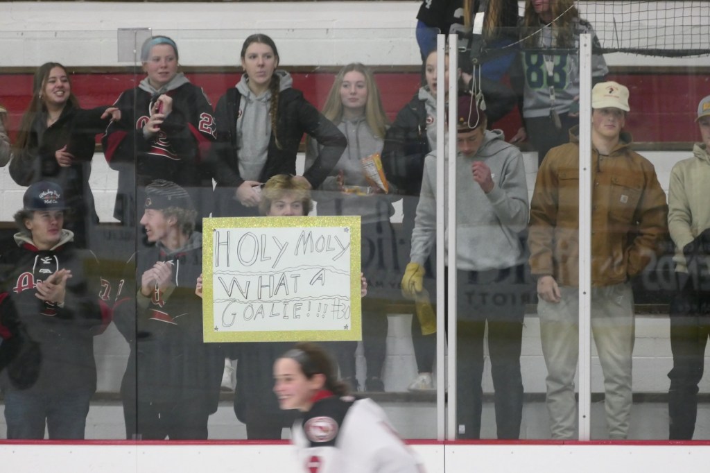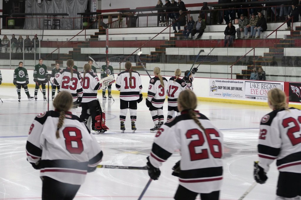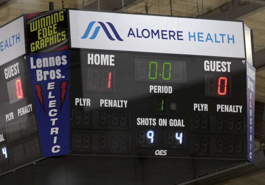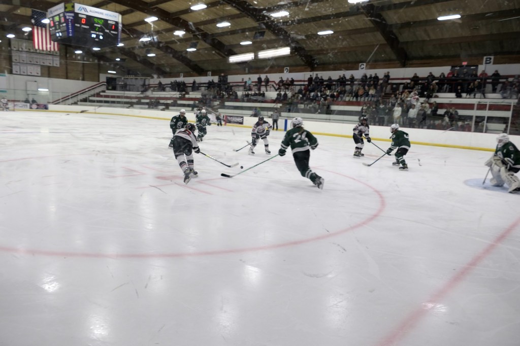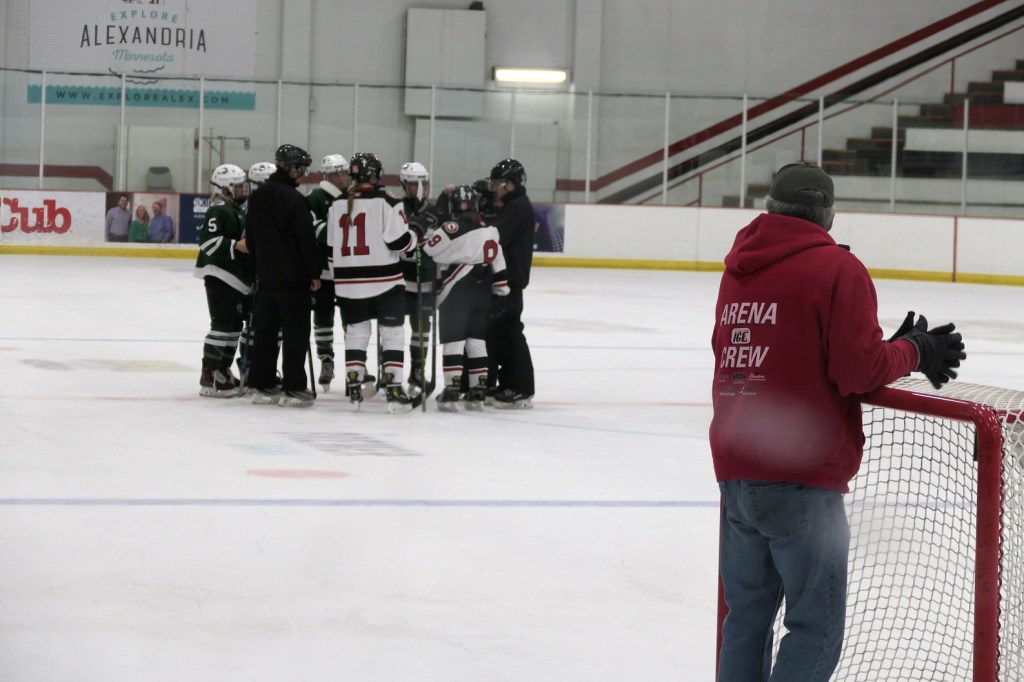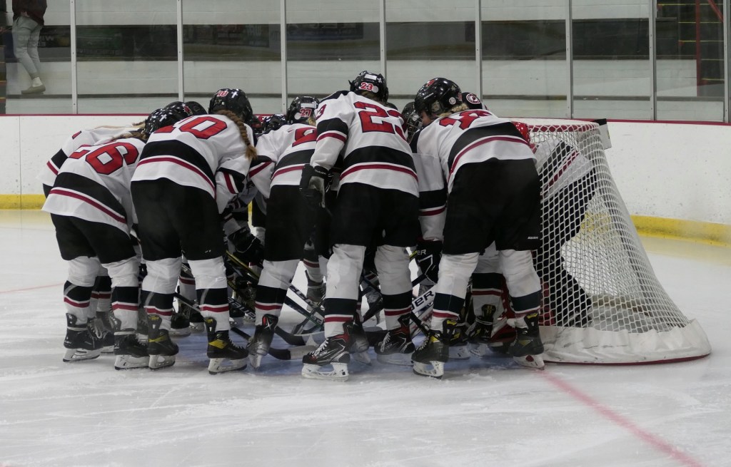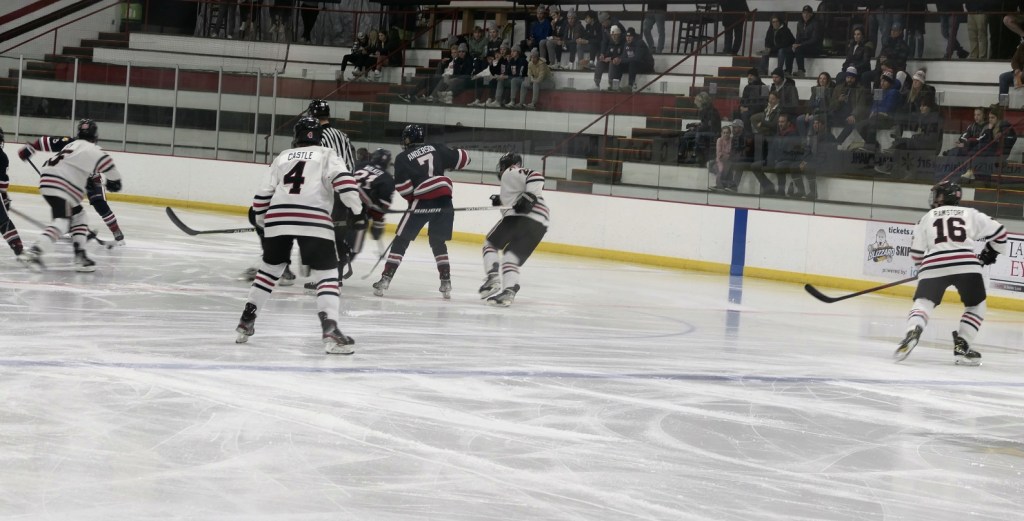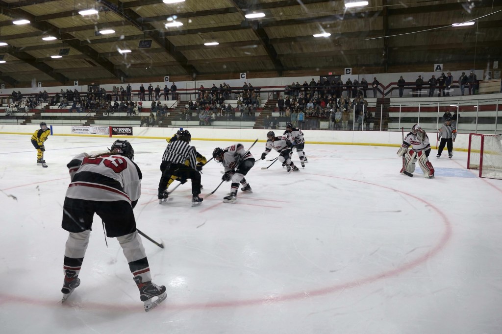 [Our senior captains are Trevin Hoepner (0) and Jaxon Schoenrock (4) with 6’9″ junior center Grayson Grove (2). The aforementioned Ella Grove was at the game on support of her little brother . . . ]
