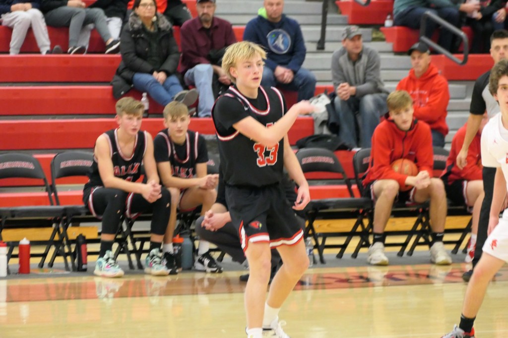 [The varsity came out for warmups. Chase Thompson (3) is a 6’7″ sophomore who is also the quarterback for the football team; Bralyn Steffensmeier (11) is a junior who has taken over the point guard position from his brother Carter who graduated last year . . . ]
