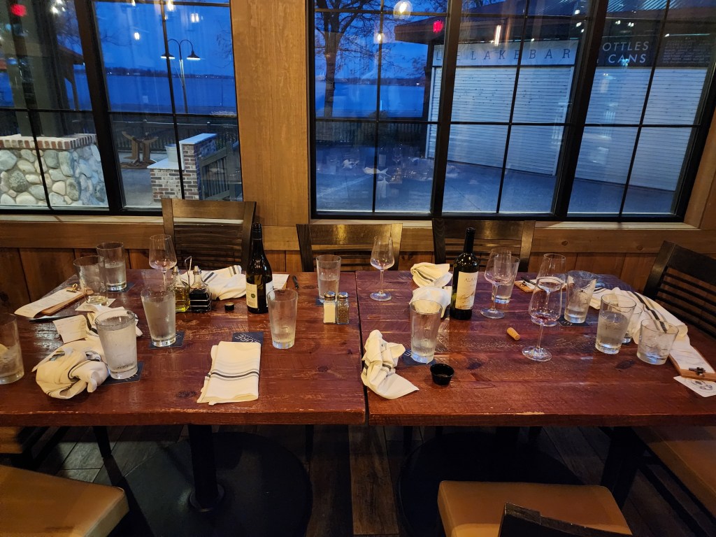 [The usual suspects gather for Wednesday night fine dining at Lure Lakebar . . . ]